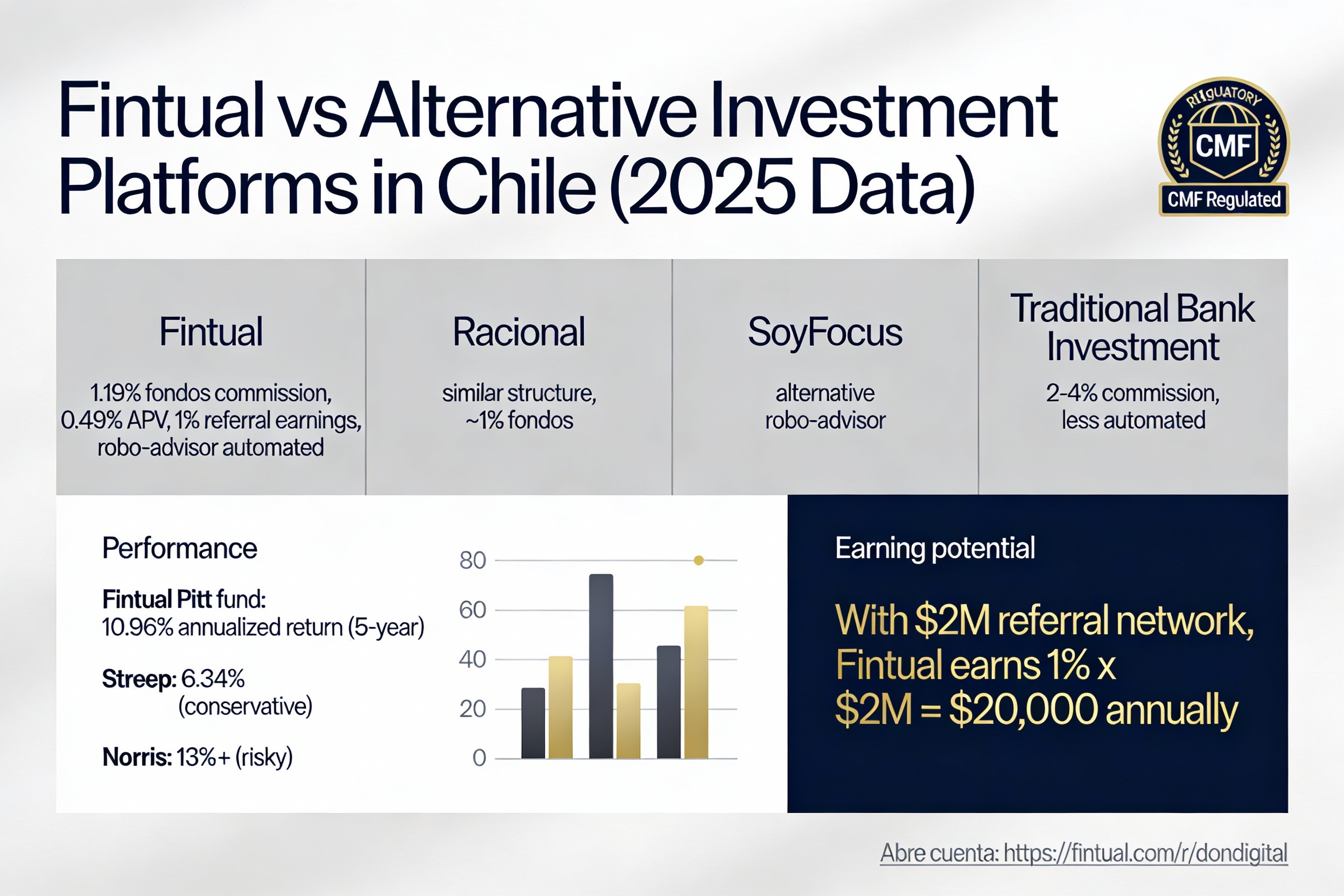 Fintual es la plataforma de inversiones digital más grande de Chile, operada bajo supervisión de la Comisión para el Mercado Financiero (CMF), que gestiona más de US$1.200 millones en activos (AUM) para más de 300.000 usuarios. A diferencia de bancos tradicionales que cobran 2-4% de comisión anual, Fintual cobra solo 1,19% en fondos regulares y 0,49% en APV, todo gestionado automáticamente mediante un robo-advisor (asesor algoritmo). El programa de referidos de Fintual ofrece 1% de comisión sobre el saldo promedio que mantienen tus referidos, con posibilidad de ganar dinero recurrente mientras esos usuarios mantengan sus inversiones activas. Este reportaje presenta un análisis exhaustivo basado en datos 2025 verificables, mostrando cálculos realistas de ingresos, estrategias de monetización, y comparativa honesta con competidores. Datos precisos, sin inflación de proyecciones.