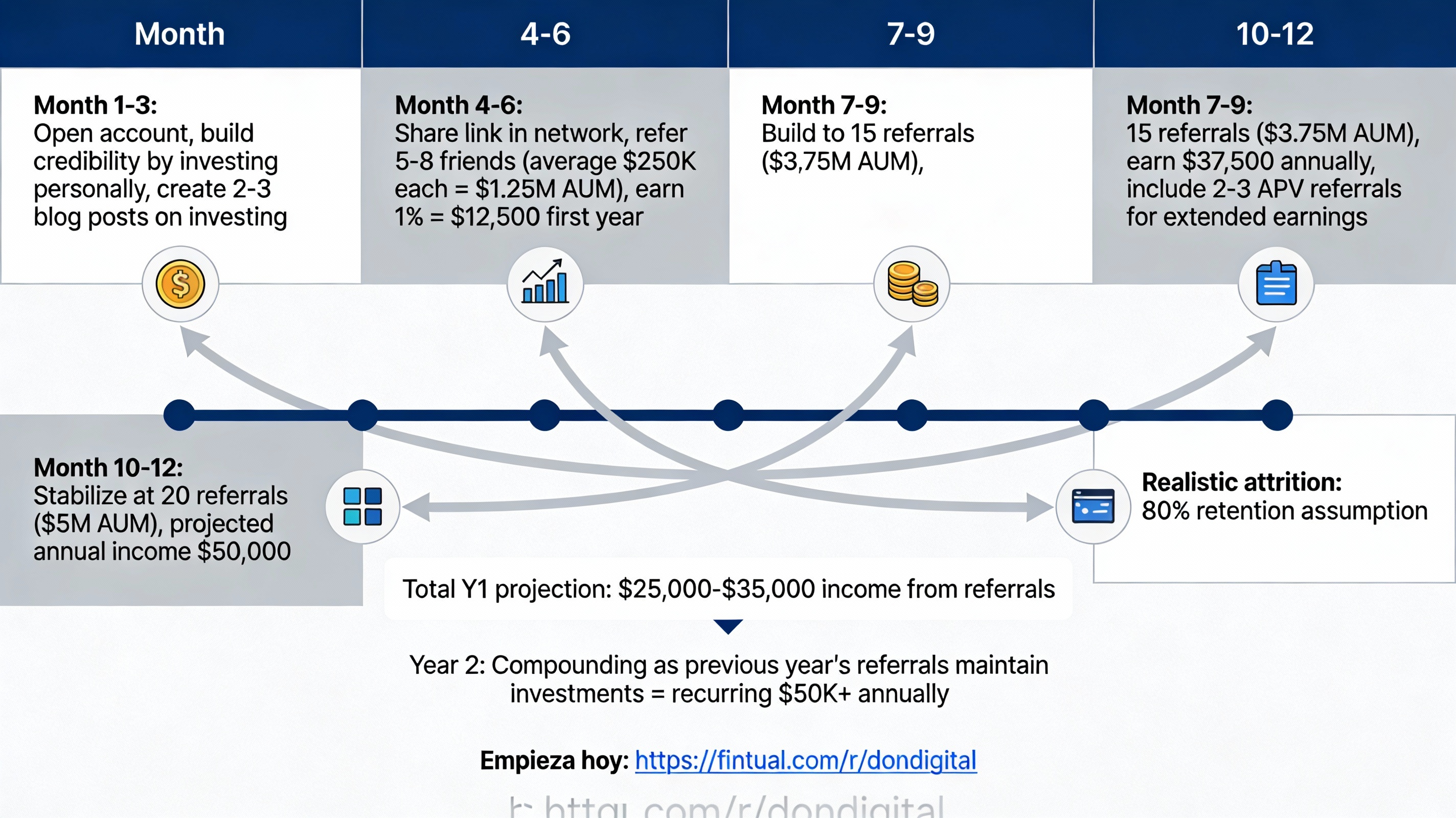 Estrategia realista de 12 meses para construir una red de referidos de Fintual que genere entre $25,000 y $50,000 en ingresos pasivos anuales.